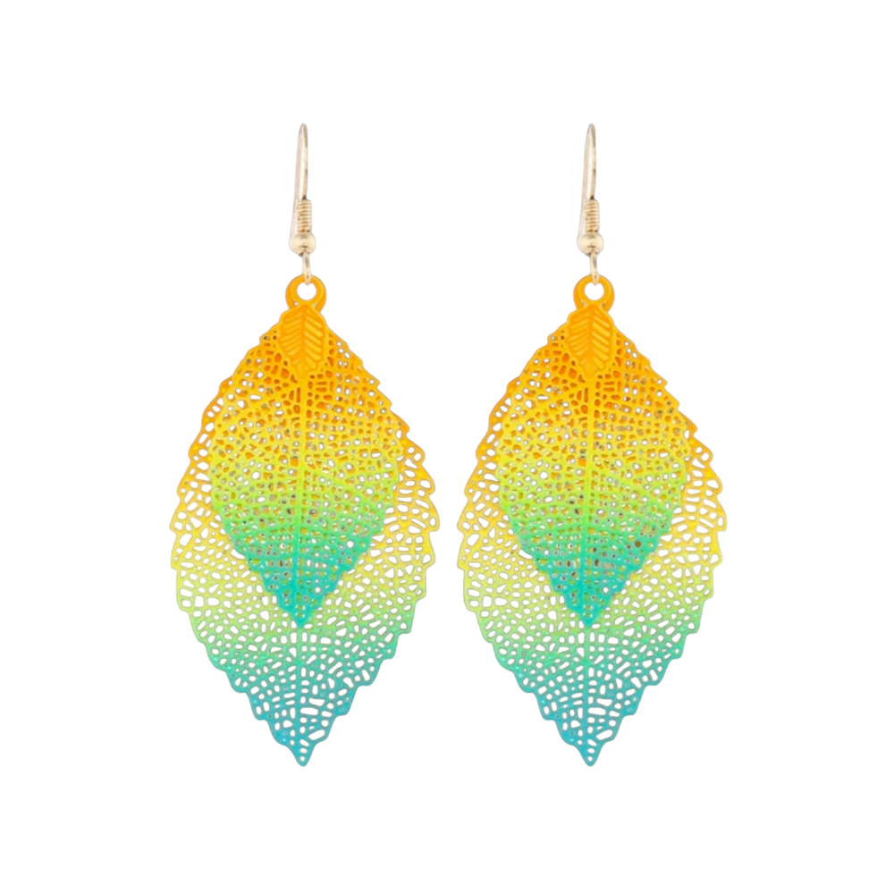 Hermosos aretes de colores en forma de hoja con una paleta de colores naranja, amarillo, verde y azul.