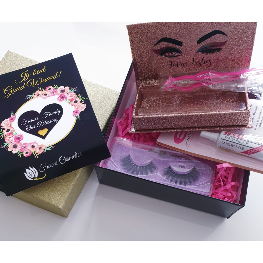 De set bestaat uit een wimper bewaardoos , wimpers, lijm en een wimpertang.