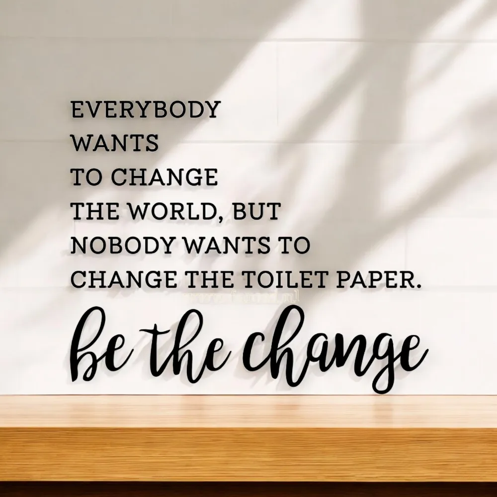 Grappige muur of deursticker 'Be The Change' voor in de badkamer of op het toilet.