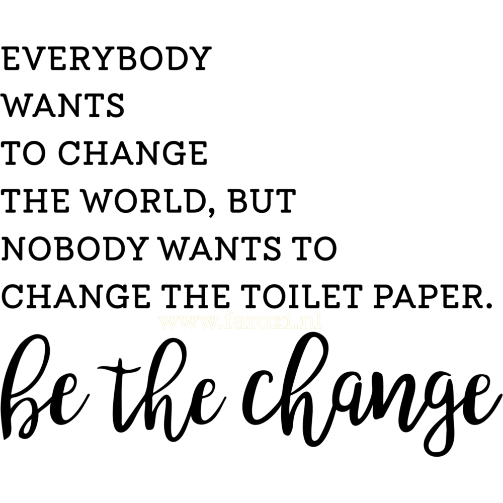 De volledige tekst is zoals op de foto: Everybody Wants to Change The World, But Nobody Wants to Change The Toiletpaper. Be The Change. Leuk om voor jezelf te bestellen of om cadeau te geven.