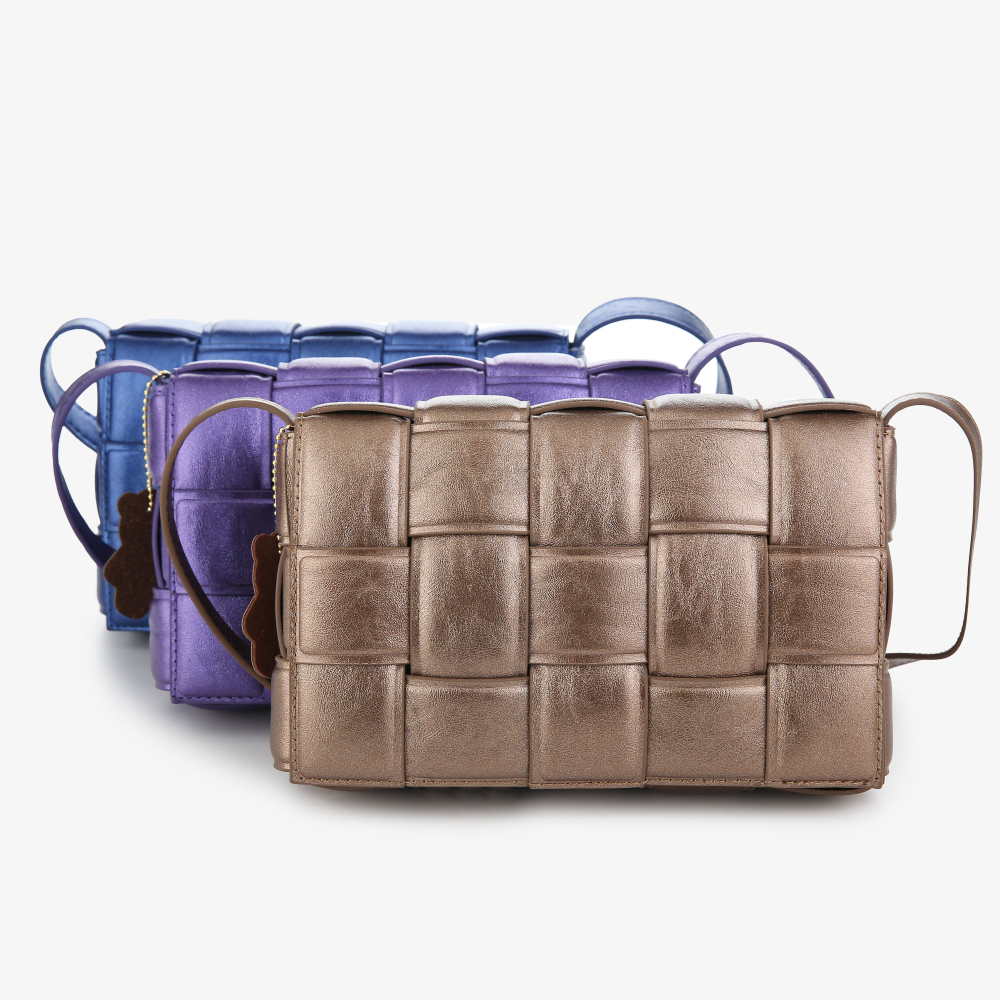 Stijlvolle gevlochten schoudertas in de kleur Paars metallic met voldoende ruimte voor je mobiel, sleutelbos en je portemonnee.