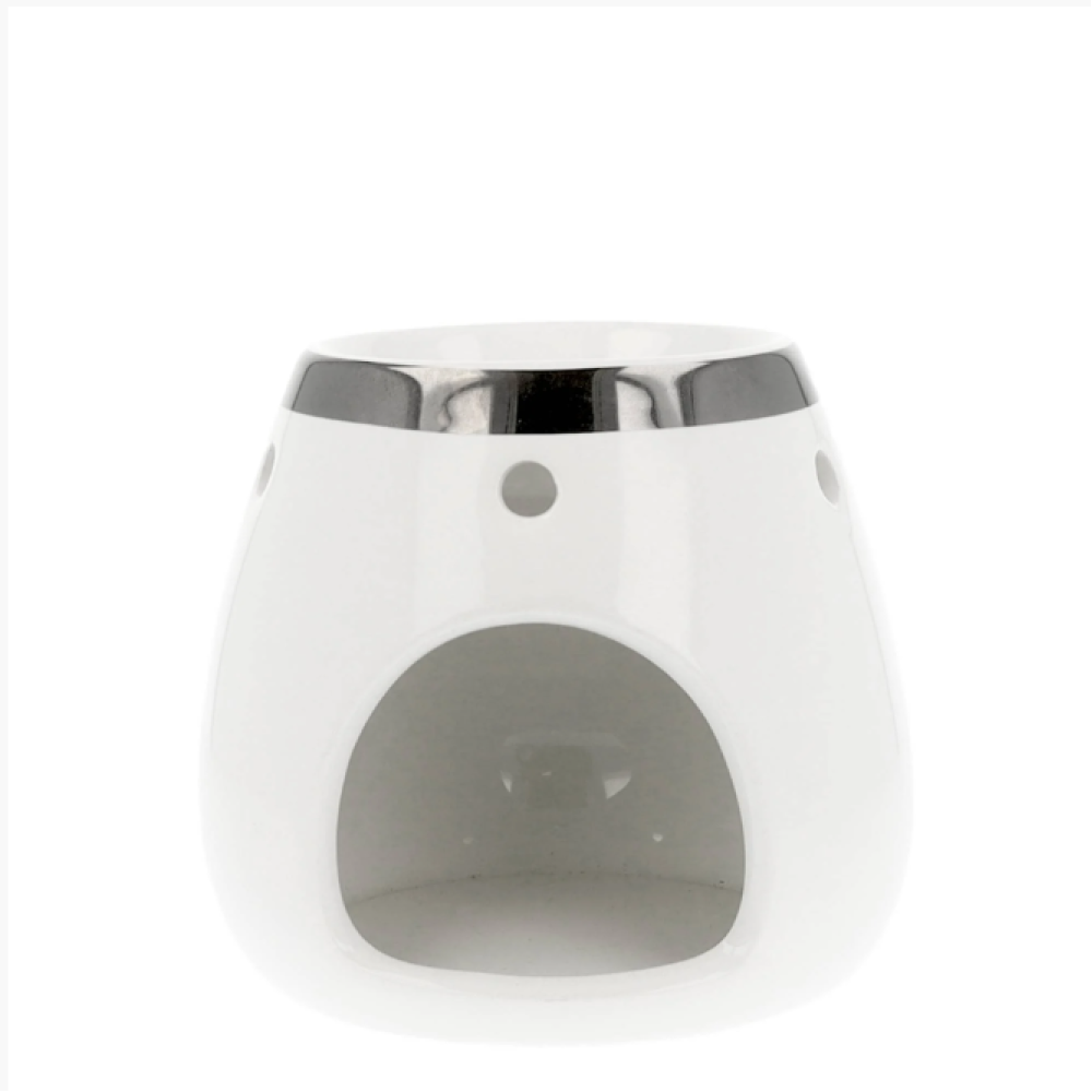 Shop snel deze vaasvormige witte geur-waxbrander met zilveren rand via Faroxi.nl.